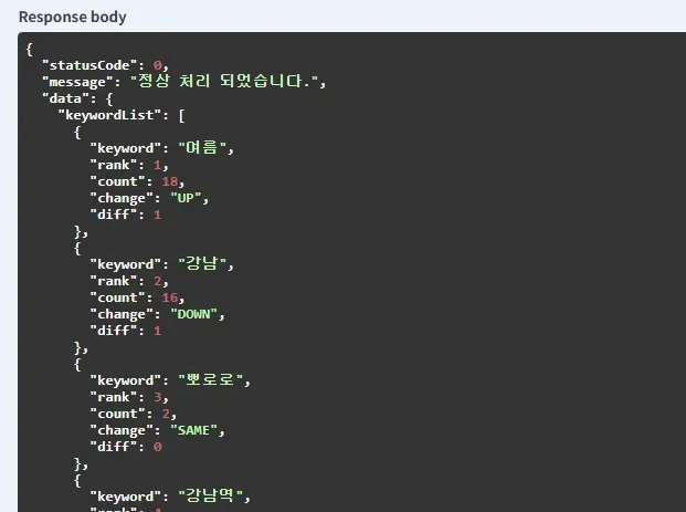 - 실시간 인기 검색어는 최대 10개를 반환하며, 순위 변동(상승, 하락, 동일, 신규) 정보가 함께 제공된다.
